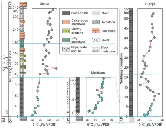 Previous studies have conducted a detailed stratigraphic subdivision and correlation of the adjacent Jinsha section and others (ca. 110 km west of Meiziwan section) [23,41,42]. Owing to the incomplete exposure of the Niutitang Formation at Meiziwan, the stratigraphic correlation of the Meiziwan, Jinsha, and Yuanjia sections was conducted using previous data. Carbon isotopic chemostratigraphy has been proven as a reliable proxy for regional and global stratigraphic correlation, especially in the fossil-poor deep water E–C successions [36,41,43,44,45,46]. Because the Niutitang Formation is carbonate-poor at the Meiziwan section, only organic carbon isotopic compositions (δ13Corg) could be obtained and are thus exclusively applied to define its stratigraphic correlation with Jinsha and Yuanjia sections (Figure 2). In this study, δ13Corg and TOC are positively correlated generally (Figure 3), indicating that the variations of δ13Corg are not affected by thermal alteration during diagenesis; if so, a negative correlation between them would be observed since light carbon (12C) is more easily lost and heavy carbon (13C) is gradually enriched due to thermal degradation during diagenesis [47,48]. Hence, δ13Corg data in this study represent near-primary signals of carbon isotope variations of the Niutitang period. Based on the generally increasing trend of the δ13Corg upsection, the Niutitang Formation at Meiziwan can be correlated to the lower member of the Niutitang Formation at Jinsha and Yuanjia (Figure 2) [41]. The covered interval is assumed to be equivalent to the phosphoritic shale of the basal Niutitang Formation.