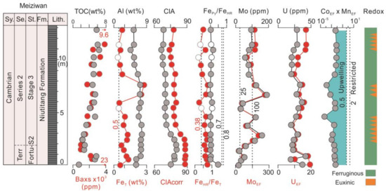All geochemical data for the Meiziwan section are given in the Supplementary Materials Table S1, and key geochemical data are shown in Figure 4. TOC and Baxs values generally increase upwards, ranging from 1.5 to 6.3 wt.% (mean 4.4 wt.%) and 984 ppm to 23022 ppm (mean 3640 ppm), respectively; δ13Corg ranges from −35.41 to −31.82‰ (mean—33.07‰); Al ranges from 4.61 to 7.71 wt.% (mean 6.66 wt.%); FeT ranges from 0.4 to 2.8 wt.% (mean 1.0 wt.%); FeHR/FeT ranges from 0.21 to 0.76 (mean 0.54); Fepy/FeHR ranges from 0 to 0.48 (mean 0.07); Mo ranges from 17.4 to 188.2 ppm (mean 80.3 ppm); MoEF ranges from 28.5 to 262.9 (mean 121.8); U ranges from 19.3 to 41.4 ppm (mean 27.0 ppm); UEF ranges from 8.5 to 19.3 (mean 13.3); Mo and U concentrations, as well as MoEF and UEF values are more variable in the low part of the section, while generally remain constant in the upper part of the section. Mo/TOC ranges from 6 to 59 (mean 20); CIA and CIAcorr generally displays a decreasing trend upwards, ranging from 66.6 to 80.2 (mean 72.4) and 73.9 to 88.2 (mean 81.0), respectively.