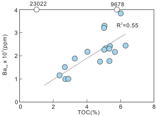 Crossplot of Baxs and TOC contents for the Meiziwan section. Note that the two samples which are considered as outliers (unfilled symbols) were not included in the correlation.