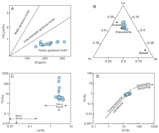 Discrimination diagrams illustrating sedimentary provenance and recycling effect. (A) TiO2 vs. Zr [89]. Samples from Niutitang Formation suggest that the source rocks were predominantly felsic. (B) La-Th-Sc ternary diagram [90]. Samples from Niutitang Formation are plot close to granodiorite. (C) Th/Co vs. La/Sc diagram [91]. Samples from Niutitang Formation are consistent with a silicic rocks source. (D) Th/Sc vs. Zr/Sc diagram [88]. Samples from Niutitang Formation plot in the area with no sediment recycling effect.