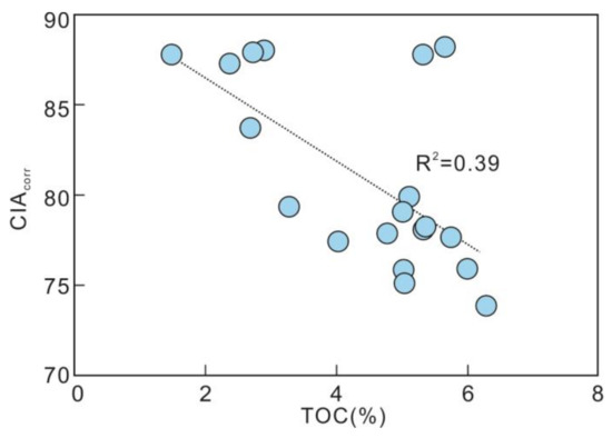 Crossplot of CIAcorr vs. TOC for the Meizwan sediments.