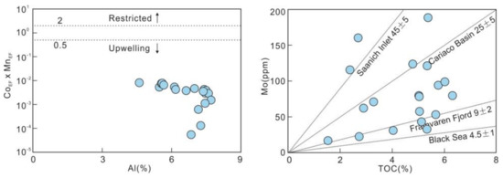 Crossplot of CoEF × MnEF vs. Al showing upwelling influence for the Meizwan sediments, and the dashed lines are adopted from Sweere et al. [95]. Crossplot of TOC vs. Mo indicating generally good connection between Meiziwan and the open ocean, and the trend lines are modified from Algeo and Lyons [70].