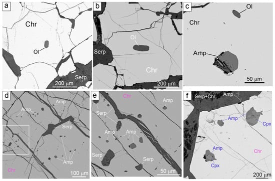 Figure 4. (a) Silicate inclusions in the chromite from deposits of the Dzharlybutak group. (a,b) Relic olivine inclusions, (c) neighbor inclusions of olivine and amphibole grains, (d,e) numerous inclusions of amphibole grains and olivine grains replaced by serpentine, (d) general view, (e) detailed image, (f) inclusions of amphibole and amphibole–diopside intergrowths. Amp—amphibole, Cpx—clinopyroxene, Chl—chlorite, Chr—chromite, Ol—olivine, Serp—serpentine.