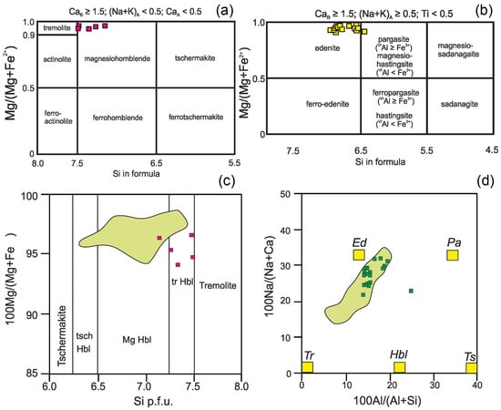 Figure 5. Composition of amphiboles from inclusions in Dzharlybutak chromite grains: (a,b) classification diagrams for amphiboles, following [42]; (c) 100 Mg/(Mg + Fe) vs. Si p.f.u. for amphiboles, following [32]; (d) 100 Na/(Na + Ca) vs. 100 Al/(Al + Si) for amphiboles, following [32]. Fields in (c,d) are compositions of amphibole grains from Kempirsai chromitite (Main Ore Field), following [32]; Ed—edenite, Hbl—hornblende; Pa—pargasite, Tr—tremolite, Ts and Tsch—Tschermakite.