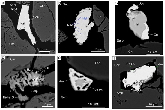 Figure 6. Minerals of base metals (Fe, Ni, Cu, Co) between and within the Cr-spinel grains from the Dzharlybutak group deposits. (ad) Heazlewoodite grains in serpentine, filling cracks in a chromitite aggregate: (a) nickeline rim around heazlewoodite grains, (b) tiny inclusions of nickeline in heazlewoodite grains, (c) native copper in the periphery of the heazlewoodite grain, (d) partially oxidized heazlewoodite grain with tiny PGM inclusions in a chromite grain crack, (e) zoned intergrowth of Co-bearing pentlandite and awaruite in the serpentine matrix, (f) complex inclusion in the chromite grain that contains amphibole, Co-bearing pentlandite and awaruite. Amp—amphibole, Awr—awaruite, Co-Pn—Co-bearing pentlandite, Chr—chromite, Hzl—heazlewoodite, Serp—serpentine.