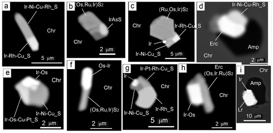 Figure 9. Morphology and internal structure of PGM intergrowths in chromitites from the Dzharlybutak group deposits. (a) intergrowth of Ir-Ni-Cu-Rh-S and Ir-Rh-Cu-S phases of rod-like morphology in the chromite, (b) intergrowth of erlichmanite and irarsite in a chromite grain, (c) intergrowth of complex composition (laurite, native Ir, Ir-Ni-Cu-S and Ir-Rh-Cu-S phases) in a chromite grain, (d) intergrowth of erlichmanite and Ir-Ni-Cu-Rh sulfide with amphibole in chromite, (e) intergrowth of Ir-Os alloy with Ir-Os-Cu-Pt and Ir-Ni-Cu sulfides in a chromite grain, (f) rod-like intergrowth of Ir-Os alloy and erlichmanite in chromite, (g) four-phase intergrowth of Ir-Ni-Cu, Ir-Rh and Ir-Pt-Rh-Cu sulfides with native Ir in a chromite grain, (h) intergrowth of erlichmanite and Ir-Os alloy in chromite, (i) intergrowth of laurite and native Ir with amphibole in a chromite grain. Chr—chromite, Erc—erlichmanite, Lr—laurite.