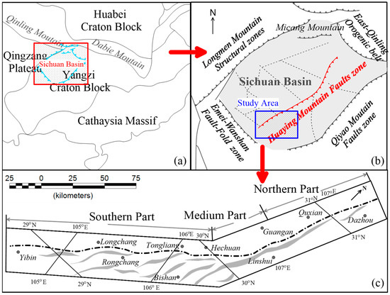 Location Map of Huaying Mountain Faults Zone. (a) is the tectonic outline map of Yangtze craton (The revision from Li et al., 2019 [7]), the red rectangle is the range of (b), the blue line is the scope of the Sichuan Basin; (b) is the tectonic outline map of Sichuan Basin (revision from He et al., 2011), the blue rectangle is the study area in this paper; (c) is the distribution of the Huaying Mountain fault, which is shown in red line in (b) (revision from Wang et al., 2018 [8]).
