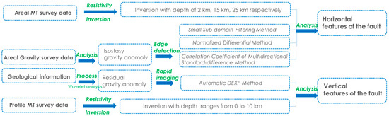 The gravity survey and MT survey were both the ground measurements in this research. The area of the real gravity data was measured at 1:250,000-scale is about 27,300 km2, the grid distance is 2 × 2 km, it was acquired from 2019 to 2021, using CG-5 and CG-6 gravity metres (Scintrex Ltd., Concord, ON, Canada). The accuracy is 0.023 mGal which is obviously superior to the technological standard (The technological standard is “The Standard of 1:250,000-scale Areal Gravity Prospecting”, it is published by Ministry of Natural Resources of the People’s Republic of China, it clearly demands the accuracy should be superior to 0.150 mGal). Furthermore, for the reason that such extensive survey area, we set the number of 34 gravity base points which constitutes 9 gravity loops, and the gravity conjunction was measured based on the technological standard, and the accuracy is 0.028 mGal which also guarantee the reliability of gravity survey greatly. With the geological characterize of research target that Huaying Mountain Faults, in the processing of gravity data, we interpolated the data with grid distance 1 km, which is believed to be reliable referring the technological standard generally. MT data were obtained in 2019 using a V5-2000 electromagnetic instrument (Phoenix Geophysical Co., Toronto, ON, Canada). The point distance of the measured MT profile was 2.5 km, and the grid distance of the measured areal MT data was 20 × 20 km. The accuracy satisfactary the demand of MT survey technology standard (be superior to 5%), its most worst standard deviation is 4.98%. The methods used to identify the geological structures in the southern HMFZ are shown in Figure 3. Based on real gravity and MT data, as well as other geological information, the features of individual faults were identified. Measured MT data were used to perform resistivity inversion, and different-depth planes were constructed using the inversion results. The results enabled us to characterize the planar distribution of fault structures in the HMFZ.