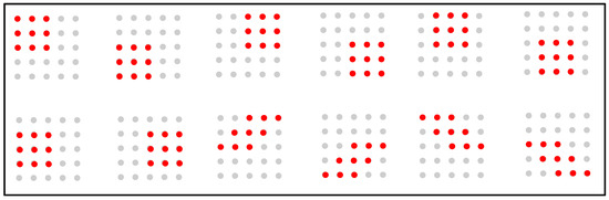 In Equations (1) and (2), is the i-th sub-domain anomaly mean, is the j-th sub-domain anomaly of the i-th sub-domain, is the i-th sub-domain standard deviation, and N = [(M + 1)/2]2 is the number of anomaly points in each sub-domain. (2) Determine the smallest of . (3) Take the sub-domain mean value corresponding to as the center point filtered value of the window. (4) Move the filter window to the next point and repeat steps 1 to 3 until the entire calculation region is covered. The sub-domain style is shown in Figure 4.