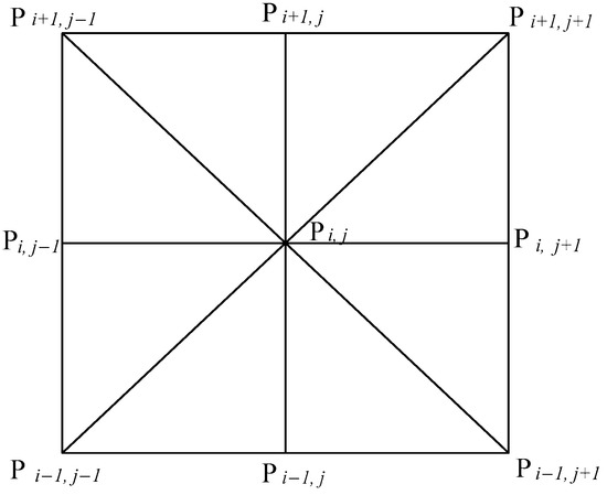 Then, it establishes the inequalities along four directions (the horizontal direction, vertical direction and two diagonal directions) as Figure 6, then calculate the number of the establish-inequality which equals to , where is the significance level that ranges from 0 to 4 (Equations (11)–(13)).