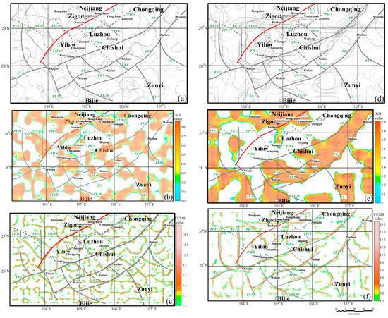 The result map of different edge-detected methods (a) SSDF, (b) ND and (c) CCMS reflect the shallow information; (d) SSDF, (e) ND and (f) CCMS reflect the deep information.