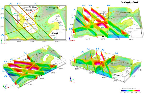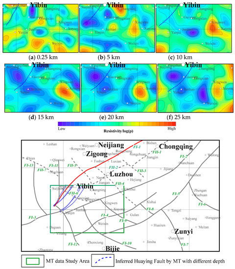 To study the vertical characteristics of the southern portion of the HMFZ, inversion was performed at different depths using MT data (Figure 10). The inversion results for depths of 0.25 km, 5 km, 10 km, 15 km, 20 km, and 25 km are served to track the development of the HMFZ (stippled blue line in Figure 10). The position derived from the 0.25 km inversion result is consistent with the inference based on gravity data (Figure 6), with an obvious NE trend. Inversion results associated with depths from 10–25 km reveal a stepped belt, where the extension of the HMFZ disappears. These large-scale inferred faults, which reflect a NW trend and deep burial, also agree with the inference of FI-12 (Figure 9). Moreover, the inversion results for depths of 0.25–5 km reveal a small NNW-trending fault that expands from Pingshan to Gaoxian. As depth increasing, this trend becomes weak, indicating shallow burial and corresponding to FII- 6 (Figure 9); according to the results from various depths, its dip is nearly vertical, but its linear characteristic from Junlian to Weixin and NWW-trending features is obvious. As depth increases, these features are enhanced, indicating that the HMFZ is large in scale and buried deeply, which agrees with gravity inversion results (Figure 9). Meanwhile, the planar projections at different depths (Figure 10) indicate that the southern part of the HMFZ (FI-1) trends SE and is linked to deep burial, with its extension limited by a NW-trending structure. From the referred results (Figure 9), most of the subsidiary faults impact NE or NNE; furthermore, based on the MT inversion result (Figure 10a), most subsidiary faults disappear with the depths deeper than 5 km, and it was inferred that their burial depths range from 0 to 5 km.