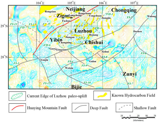In this study, we inferred the formation and accumulation of oil and gas, as well as the reservoir distribution in the Luzhou palaeo uplift. We also evaluated the relationship between oil and gas fields and structural features based on measured gravity data. The Luzhou palaeo uplift is shown in the study area in Figure 13 (shaded green; refer to [51]), and the known locations of oil and gas fields (shaded yellow in Figure 10; refer to [51]) are marked in the gravity interpretation map. As shown in Figure 13, it is clear that the known hydrocarbon field is highly related to the distribution of the faults. Near the Neijing-Zigong area, the oil/gas field is in macro-shapes and striking along NE and NNE which is corresponding to HYMZ (FI-1), it means the distribution of these fields is controlled by HYMZ, HYMZ is developing well and effect the accumulation of the reservoirs, and near Yibin, the reservoirs also are existing, so the near HYMZ is well base for oil/gas accumulation. Inside the Luzhou paleo uplift, the oil/gas fields’ distribution is affected by the secondary faults mainly, the large faults that HYMZ (FI-1) and Qiyao Mountain Fault (FI-2) determines the accumulation of these fields. Furthermore, the late small-scale fault played the role of migrating-channel; thus, the distribution is controlled by secondary faults obviously.
