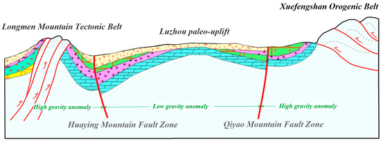 As clearly shown in Figure 13, the Luzhou paleo uplift is located between FI-1 and FI-2, and the axis formed by the Luzhou low-anomaly and Yongchuan high-anomaly areas corresponds to the NNE distribution of the uplift core. It infers that the developing of Luzhou paleo-uplift is controlled by HYMZ and the Qiyao mountain fault zone. On the other hand, the location of paleo-uplift is in the low gravity anomaly area. Furthermore, the Luzhou low-anomaly closure shows an obvious gradient in the southwest, whereas the northeast wing is relatively wide and gentle, indicating that during its formation, the principle controlling factor was tectonic stress. It inferred the evolution of Luzhou paleo uplift is linked to the Xuefengshan Orogenic Belt along the southeast margin, which caused northwest compression. The formation of the Luzhou low-anomaly closure was closely related to the movement of the Huanan Block during the Indosinian Orogeny, as shown in Figure 14 [17].