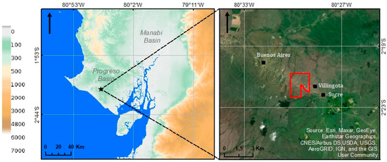 Location map of the study area in Santa Elena Province, Ecuador. Universal Transverse Mercator Projection (WGS 84—17S). Elevation data and satellite image information from Instituto Geográfico Militar (http://www.geoportaligm.gob.ec/dtm/wms (accessed on 28 February 2022), Esri, Maxar, Geoeye, Earthstar geographics, CNES/Airbus DS, USDA, USGS, AeroGRID, IGN, and the GIS User Community.