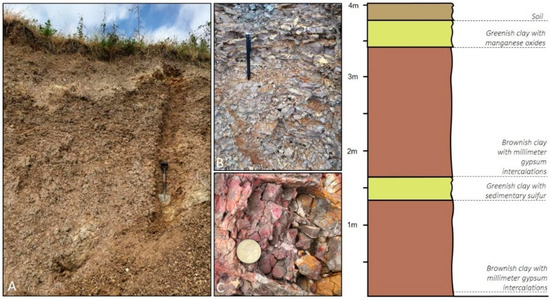 Outcrop (A–C) and geological column of the natural clays, iron, and manganese oxides that can be observed in some areas of the study area, the Dos Bocas formation, Santa Elena province, Ecuador.