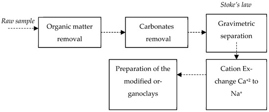 The smectite content can be improved by removing the gangue compounds associated with weathering or the composition of the rock, such as humic acids (organic components), iron oxides, carbonates, quartz, and feldspars, among others. Quartz and clays, such as kaolinite, can be removed by granulometric methods if their particle size is more significant than smectites (≥2 µm), such as by sieving, magnetic separation, and gravimetric separation (particle settling speed—Stokes Law). Previously, a reduction in grain size and separation was performed through ultrasound and centrifugation treatments [14]. Figure 4 shows the scheme of the previous purification process to prepare the organoclay.