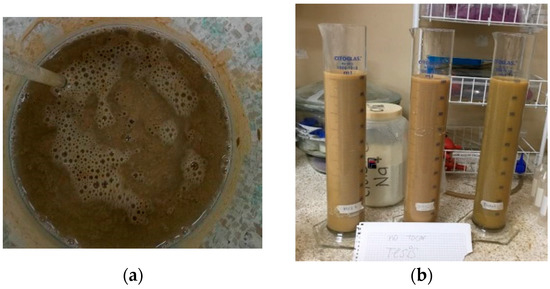 Initially, the clay aggregates were ground using a Retsch PM 100 ball mill. An amount of 50 g of clay was dispersed in 50 mL of distilled water using beakers, as shown in Figure 5a. To remove the organic matter, successive doses of 10 mL of hydrogen peroxide (10%) were added and stirred with a glass rod until the reaction with the organic matter was stopped (about 50 mL was used). The solution was left to stand for at least 12 h in an oven at 60 °C. An additional 10 mL of hydrogen peroxide was added to verify no further reaction. The solid phase was separated by centrifugation at 3000 rpm for 5 min. In this process, 50 mL of distilled water was added to the separated bentonite and stirred with the glass rod, and the solution was allowed to settle down; then, the excess water was removed, and the procedure was repeated three times. Finally, it was dried for 24 h at 60 °C in the oven.