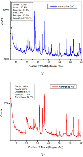 Figure 8a,b show the characteristic peak of sodium clays, which is in the range of 6–8°, with an approximate interplanar distance (d001) of 12.4 Å; generally, the basal space of calcic smectite is around ~15 Å [13]. This difference in basal spacing is due to the size of the atomic radius of sodium, which is smaller than calcium; this explains why sodium clays have a greater swelling capacity. For this reason, the cationic exchange from Ca2+ to Na+ was carried out so that our sodium clay can absorb more surfactant between its layers and thus facilitate a better intercalation.