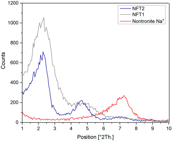 Figure 9 shows that the characteristic peak of the first diffraction observed in the treated clay is shifted to an offset angle of ~2–3° for both organo-modified clays (NFT1 and NFT2). This phenomenon represents an exchange cation with the alkylammonium salt due to the higher basal (~37.9 Å) spacing than Nontronite Na+ (~12.4 Å). An increase in basal spacing is referred to as good intercalation of the cationic compounds in the clay layers. The basal spacing seems to be related to large hydrophobic groups on surfactants and the decrease in surface energy [10]. Similarly, this effect is also observed in the NFT2 diffractogram, where the organo-nontronite presents the highest peak at 38.1 Å. These basal spacings are related to a pseudo-molecular orientation of the alkylammonium ions into the silicate layer [7]. Both arrangements are consistent to the long chain of the surfactant and the high surfactant loading used in this research. Surfactants were observed due to the basal spacings in both organoclays NFT1 and NFT2 [17].