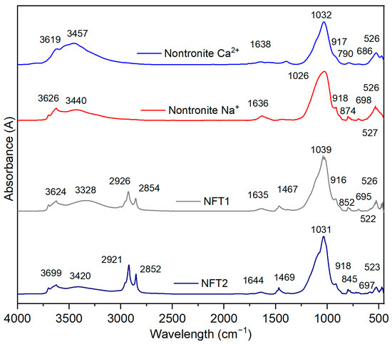 Additionally, the appearance of new vibrational bands is evident due to the addition of surfactants. The bands around ~2922 cm−1 and ~2852 cm−1 correspond to the asymmetric and symmetric stretching vibrations of the CH2 bands, respectively [18,22], as shown in Figure 10 and Table 4. The vibrations produced by the scissoring bend belonging to the CH2 bands are observed at ~1467 cm−1. The characteristic bands of the organoclays NFT1 and NFT2 are still maintained after modification by the surfactants, as shown below.
