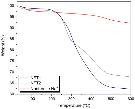 Additionally, results show that the thermal properties are enhanced in NFT1 compared to NFT2. Table 5 shows the degradation temperatures of the organoclays, where the excess of the surfactant used can be seen because the percentage of degradation increases in the temperature range where the alkylammonium salt used is degraded.