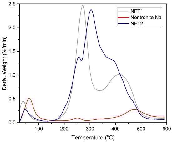 The differential TG plot (Figure 12) shows again that the intervals of decomposition of intercalated surfactant in the organoclay take place in three stages where there are considerable mass losses due to: (a) surfactant cations intercalated in the intermediate layers of the clays, caused by the cation exchange performed, and attached to surface sites by electrostatic interaction; (b) surfactant (cations and molecules) physically adsorbed on the external surface of the clay; and (c) molecules of the surfactants located within the intermediate layer of the clay [28]. The initial decomposition of NFT1 occurs around 40 °C (T1), and there is a mass loss corresponding to the water molecules located on the surface of the organoclay. Surfactant degradation (stages b and c) occurs at around the following temperatures: 270 °C (T2) and 420 °C (T3), respectively. Additionally, two phenomena that occur at the time of performing these thermal tests can be observed: (a) there is more significant degradation of the surfactant, and (b) there is a slight improvement in the intercalation of the surfactant in the organoclay processed with Ecuadorian raw material (NFT1) at ~421 °C (T3). In addition, the hydrophobicity of the NFT1 caused by the use of the surfactant can be evidenced since the same degradations caused by the water vapor do not appear in comparison to the nontronite Na+. The decomposition of NFT1 has its highest weight loss around 270 °C and 420 °C due to the degradation of the surfactant [28]. The decomposition NFT2 shows more stages of degradation mentioned above regarding the consumption of the surfactant. The decomposition of NFT2 has its highest weight loss around 300 °C and 400 °C due to surfactant degradation.
