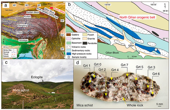 (a–c) Tectonic framework and geological map of the study area (after Cheng et al., 2018 [5]), showing the field occurrence of the sample in the North Qilian mica at the Baishiyazi valley. (d) A photograph of the highly weathered sample shows the extracted garnet grains for geochronology.