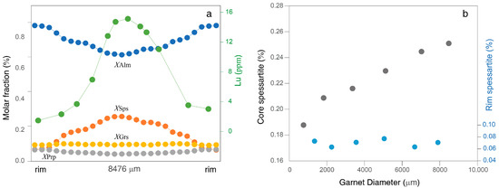 (a) Chemical zoning profiles of a representative garnet grain. (b) Garnet diameter plotted as a function of the core and rim Mn concentration, showing a correlation between the diameter and the core Mn compositions and similar rim Mn contents for different sized garnets.