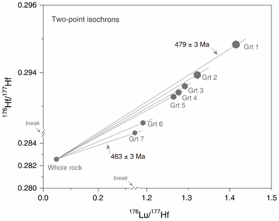 The chemically zoned garnets in the matrix show evidence of non-equilibrium growth. However, it is believed that chemical equilibrium was maintained between the growing garnet rims and the matrix during changes in the metamorphic conditions [20]. This is supported by similar rim compositions for garnets of different sizes (Figure 2). Therefore, the nucleation and growth of the different-sized garnets in this sample were likely continuous. The two-point isochron, obtained from the bulk single garnet, reflects an average time interval of the overall garnet growth. The bell-shaped Lu zoning (Figure 2) indicates that the Lu–Hf date reflects garnet growth and skews to earlier growth stages. The correlation between garnet diameters, core Mn contents, and the age variation resulting from diachronous nucleation supports the conclusion that the observed age range represents the total garnet growth time span. Therefore, the larger the garnet crystal is, the earlier and over a longer time period it records. Garnets of different sizes provide snapshots of the overall garnet growth interval, as evidenced by the statistically robust mixture line defined by the seven individual garnet samples (Figure 4) with a low mean square of weighted deviation (MSWD = 0.32) and high chi-squared value (ꭓ2 = 0.9). Therefore, the oldest age of 479 ± 3 Ma obtained from the largest garnet should be considered a minimum estimate of the initial garnet growth during the prograde metamorphic process. The youngest age of 463 ± 3 Ma obtained from the smallest garnet implies that the garnet growth at peak metamorphism terminated no earlier than ca. 463. The 16 ± 4 Myr difference between the maximum and minimum ages determined by the largest and smallest garnet grains represents a minimum duration for the overall growth process.