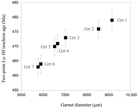 Correlation between the garnet diameters and the corresponding Lu–Hf date.