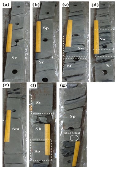 (a) Ripple cross-laminated sandstone (Sr) (3086–3087 m); (b) Planar cross-bedded sandstone (Sp) and ripple cross-laminated sandstone (Sr) (3087–3088 m); (c) Wavy-bedded sandstone (Sw) and flaser-bedded sandstone (Sf) (3089–3090 m); (d) Wavy- bedded sandstone (Sw) and planar cross-bedded sandstones (Sp) (3090–3091 m); (e) Massive sandstone (Sm) (3091–3092 m); (f) Trough cross-bedded sandstone (St), Parallel bedded sandstone (Sh) and Planar cross-bedded sandstone (Sp) (3183–3184 m); (g) Planar cross-bedded sandstone (Sp) with mudclast (3184–3185 m).