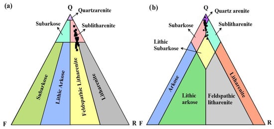 According to Folk’s (1974) [17] categorization, the sandstones of the Srikail-3 well are mainly of sublitharenite to feldspathic litharenite (Figure 5a) and by McBride’s classification (1963) [18], the sandstones are of sublitharenite to subarkosic, while a few are quartz arenite (Figure 5b) in nature.