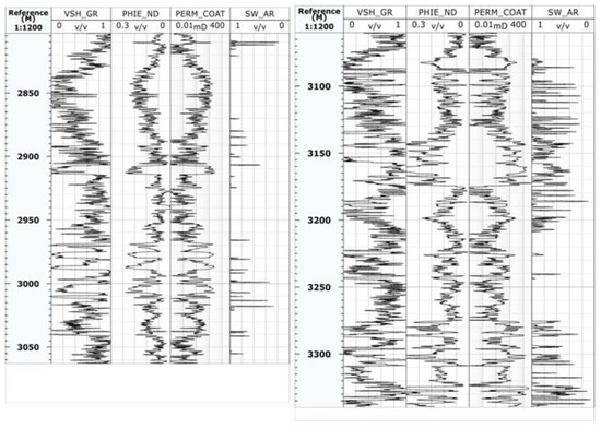 The petrophysical parameters estimated from well logs are presented in Table 3 and Figure 6. The total porosity value ranges from 6 to 35%, where the average effective porosity (PHIE) through all reservoir units is 17.76%. The maximum log effective porosity is 22.2%, which is noted to be between 3129.5 and 3176.5 m in depth, and the lowest log effective porosity is 15%, which is found between 3087 and 3129.5 m depth (Table 3). The average value for log permeability is 20 mD. In the depth range of 3129.5–3176.5 m, a higher value of log permeability up to 54 mD was observed (Table 3). Shale volumes (VSH) ranged from 9% to 15%, with an average of 11.4%, showing the comparatively clean nature of sandstones. The range of the water saturation (SW) was from 0% to 49%, indicating that the gas sands are thoroughly saturated with hydrocarbons.