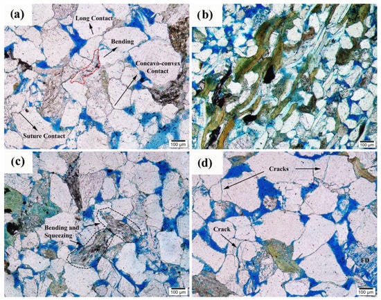 Different diagenetic processes develop with the increase in the compaction rate, which has a substantial impact on the studied area. Diagenetic processes, such as packing rearrangement of the grains including long, concavo-convex and suture contacts (Figure 8a) and the thinning, bending and squeezing of the ductile grains, took place during shallow and intermediate burial (Figure 8a–c). Brittle grain fracturing is produced by deep burial mechanical compaction (Figure 8d). All of these diagenetic processes consequently change the bulk volume of rock. Depositional porosities are brought down to their existing levels in large part through compaction [19,20].