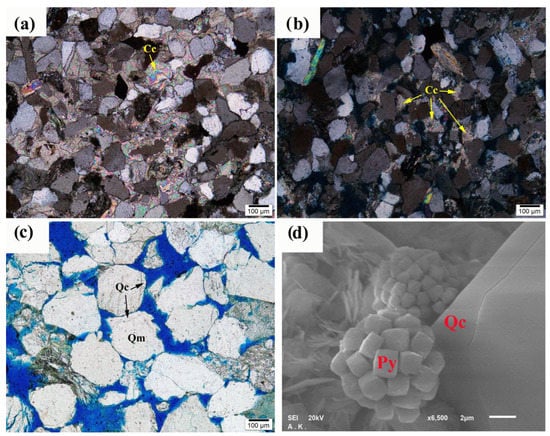 Photomicrograph showing (a) poikilotopic calcite cement (Cc) at 3179.5 m depth; (b) isolated pore-filling calcite cement (Cc) at 3085.5 m depth; (c) quartz overgrowth at 3182 m depth; (d) SEM shows framboidal aggregates of pyrite (Py) and quartz overgrowth (Qc) [4].