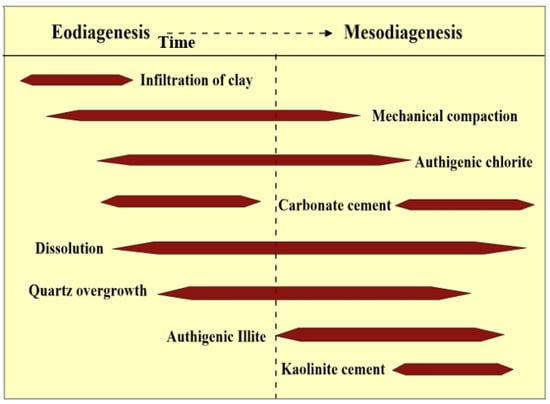 The textural relationship of the thin section and SEM observations is used to establish the sequence of diagenetic events (Figure 12). The highest temperature limit for eodiagenesis is less than 70 °C, which is typically equivalent to approximately 2 km of burial. After eodiagenesis, mesodiagenesis takes place, with a temperature limit of >70 °C and a burial depth of >2 km [22]. The sediment was initially deposited in a basin and then gradually buried, and clay infiltration (Figure 10a) may have occurred. As sedimentation increases, compaction starts as a result of overburden pressure, which is an early diagenetic phenomenon that happens just after clay infiltration. Grain contacts are one of the primary indicators of compaction effects. Long contacts, concavo-convex surfaces and suture contacts (Figure 8a) may indicate moderate to severe mechanical compaction of the sandstones [3]. Owing to the squeezing and extruding of ductile grains between rigid grains, this also has an impact on permeability [23]. As the diagenetic process moves forward, the basic processes of grain reorganization, a change in fabric or packing (such as simple cubic packing or hexagonal rhombohedral packing), ductile grain deformation (Figure 8b,c), fractures of brittle grain (Figure 8e) and pressure solution happen gradually. The textural interactions of the authigenic chlorite (Figure 10b,d) with other minerals show that they are early to late diagenetic components. The production of chlorite in the Neogene sandstones may have occurred with the replacement of detrital biotite or the transformation of antecedent infiltration or grain coating clay, or otherwise through a combination of these two processes [3]. Chlorites can also improve the compressive strength of rocks by filling the pores or coating the grains [24].