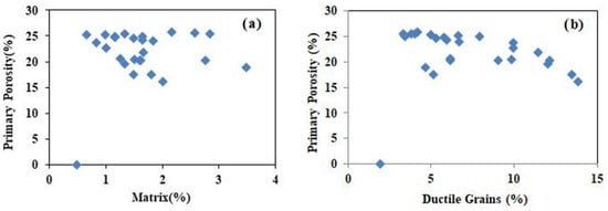 Relation between (a) primary porosity (%) vs. matrix (%) and (b) primary porosity (%) vs. ductile grains (%).