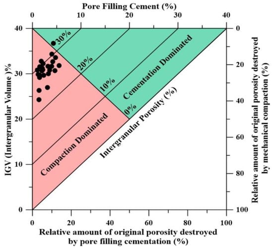 Generally, with greater burial depths, the effect of compaction becomes more pronounced. Sandstones with finer grains typically experience more compaction than sandstones with coarser grains. The effect of compaction is high in the center of the fine grain sandstone, and the edges are where the effect has the least impact. Porosity and permeability had been reduced at the depth > 2000 m owing to grain rotation and rearrangement, grain bending, and ductile deformation of mechanically-weak grains (Figure 8a–c). Sometimes, fractures developed between the brittle grains due to compression, which may increase the permeability of the reservoir (Figure 8d). The plot of Houseknecht (1987) [29]) can be used to evaluate intergranular volume (IGV), cement concentration, and porosity to determine the relative impact of compaction and cementation (Figure 14). The result shown in Figure 14 indicates that there is higher compactional porosity-loss where there is a higher initial content of ductile grains. From this diagram, it can be concluded that mechanical compaction played a major role in reducing porosity of the sandstones.