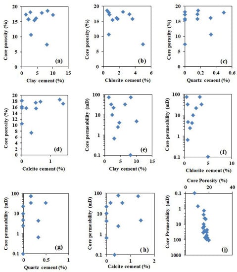 Relationship between (a) core porosity (%) vs. clay cement (%); (b) core porosity (%) vs. chlorite cement (%); (c) core porosity (%) vs. quartz cement; (d) core porosity (%) vs. calcite cement (%); (e) core permeability (mD) vs. clay cement (%); (f) core permeability (mD) vs. chlorite cement (%); (g) core permeability (mD) vs. quartz cement (%); (h) core permeability (mD) vs. calcite cement (%); (i) core permeability (mD) vs. core porosity (%).