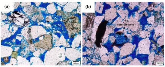 Reservoir quality is significantly influenced by dissolution. As burial depth increases, the high mechanical compaction and cementation partially to entirely eliminates the primary porosity. In the process of diagenesis, acidic fluids are discharged from the source rock that react with the framework grains of the sandstones and can dissolve low-stability silicate minerals such as feldspar and unstable rock fragments (Figure 4e and Figure 8d), which ultimately resulted in significant secondary porosity. In the studied sandstones, secondary porosities present as oversized pores (Figure 16a), moldic pores (Figure 16b) and microfractures within grains. The average secondary porosity is 6.8%, which suggests that dissolution has a considerable impact on reservoir quality in the studied sandstone from the Srikail-3 well.