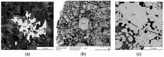 In the chromite–rutile + Ba fluid system, redledgeite (Red) and lindsleyite (Ldy) were formed. Redledgeite is a chromic analogue of Ba priderite (Prd) [16]. As a result of the reactions reproduced in a similar K system [15], the following phases were formed: lindsleyite, redledgeite, rutile and modified chromite at 1.8–5.0 GPa and 1000–1200 °C (Table S1). Lindsleyite formed small, xenomorphic grains (from 1:2 to 1:4) up to 10 μm in size, found mainly as inclusions in chromite (Chr), rutile (Rt) and redledgeite. Representative phase analyses are presented in Figure 1a,b and in Table S1. Redledgeite formed individual xenomorphic (Figure 1a, run Ba–Ti) and idiomorphic grains anhedral and suboctahedral in form (Figure 1b, run Ba-1.8) ranging in size from a few to 10–30 μm (with a maximum of up to 100 μm), also found as inclusions in modified chromite. Such forms of occurrence of redledgeite are known in natural associations [21]. At 1.8 GPa, 1000 °C, the following phases were formed in this system: redledgeite and hawthorneite (Figure 1b, Table S1, run Ba-1.8). Hawthorneite (Hwt) (Figure 1c, Table S1, run 3Ba-1) was found in the form of individual angular grains up to 80–100 μm in size, isometric shape. Lindsleyite with a size of less than 20 μm formed lighter oval or isometric inclusions in hawthorneite. Hawthorneite and lindsleyite were formed in the chromite–ilmenite + Ba fluid system at 3.5–5.0 GPa and 1200 °C. The coexisting phases were: ilmenite, rutile and recrystallized chromite. Hawthorneite crystallized as euhedral octahedral and subhedral grains up to 30–50 μm in size (Figure 1c). Lindsleyite coexisted with Ba–mica, ferrokinositalite [22] (wt %, K2O, 0.62; BaO, 22.55; MgO, 8.71; Al2O3, 16.87; FeO + Fe2O3, 12.54; SiO2, 23.62; Cr2O3, 3.55; H2O, 3.05).