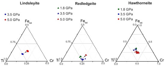 The Ti–Fe–Cr diagram shows the dependence of the Cr content in Ba oxides (lindsleyite, redledgeite and hawthorneite) on the pressure in the system (Figure 2). The composition varied according to the scheme Ti ↔ Fe + Cr. There was no unambiguous dependence for K minerals of the hollandite, magnetoplumbite and crichtonite groups [15]. With increasing pressure, all Ba oxides tended to be enriched in Cr (Figure 2).