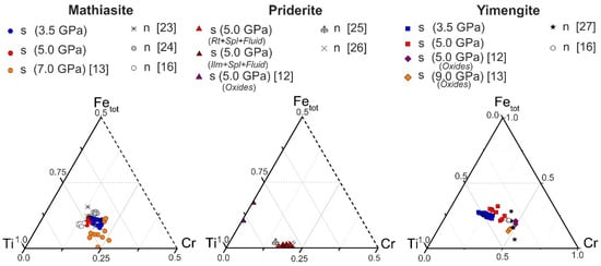 Ti–Fe–Cr diagram (apfu) illustrating compositional variations of synthetic mathiasite, priderite and yimengite. n—natural; s—synthetic.