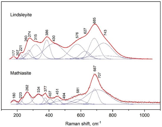 The Raman spectra of mathiasite and lindsleyite had several peaks (Figure 5); the strongest peak appeared at 685–687 cm−1 and had shoulders from both sides.
