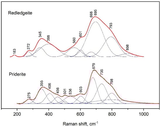 The Raman spectra of priderite and redledgeite contained two maxima at 679 and 355 and 695 and 345 cm−1, respectively (Figure 6). The strongest peak had several shoulders from the side of large wave numbers. On the other hand, we observed shoulders at 601 and 560 cm−1 only for redledgeite. In the case of priderite, bands were distinguished at positions 603, 563 and 501 cm−1. The peaks at 275 and 272 cm−1 were also present in spectra of priderite and redledgeite, respectively.