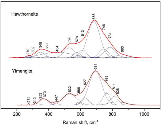 The Raman spectra of yimengite and hawthorneite were characterized by the strongest peak at 694 and 683 cm−1, respectively (Figure 7). That peak represented a contribution of three successive bands from the side of large wave numbers: yimengite—763, 811 and 828 cm−1, hawthorneite—746, 784 and 863 cm−1; from the other side, there were additional bands at 627 and 588 cm−1 for yimengite and 613 and 578 cm−1 for hawthorneite. The positions of the next peaks in intensity were at 532 and 370 cm−1 for yimengite and 528 and 348 cm−1 for hawthorneite. For both Raman spectra in the spectral range of 200–300 cm−1, there was a set of weaker bands. The Raman spectra of yimengite were consistent with the spectra of the synthetic HAWYIM solid solution [13]. In comparison to the HAWYIM solid solution, the bands in the spectra of the synthesized yimengite were shifted to higher wave numbers.