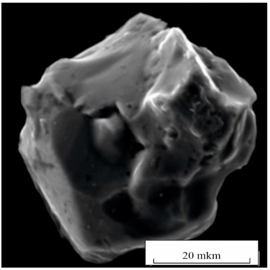 A single crystal (0.05 × 0.04 × 0.04 mm in size) of yimengite (Figure 8) was extracted from a polished sample. The crystal composition (MgO 4.44, Al2O3 2.36, K2O 4.57, TiO2 41.85, Cr2O3 23.53, MnO 2.12 and FeO + Fe2O3 19.42 wt%) corresponded to the empirical formula K0.9Ti4.87Cr2.88Mg1.03Al0.43Mn0.28O19 (the calculation was performed based on oxygen according to the previously obtained data of the EPA). The crystal structure of yimengite was refined on a single crystal based on the results of a low-temperature (T = 90 K) X-ray diffraction experiment, performed at the Belok/RSA beamline (λ = 0.74539 Å) of the Kurchatov Synchrotron Radiation Source (National Research Centre “Kurchatov Institute”, Moscow, Russia) [18].