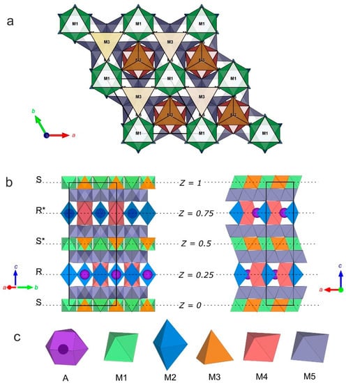 The major crystallographic characteristics, experimental conditions and refinement parameters are listed in Table S3. The atomic coordinates and equivalent isotropic parameters for the synthetic phase structure are given in Table S4. All crystallographic data are in the cif.file in Supplementary Material. The polyhedral framework of the structure of synthesized yimengite is presented in three projections in Figure 9. The structure of this phase completely corresponded to the “ideal” magnetoplumbite structure type [28]. The atomic coordinates and atomic displacement parameters are listed in Table S5.