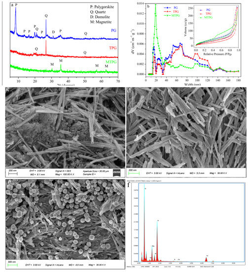 The SEM images of PG, TPG, and MTPG used in the present study are shown in Figure 1c,d,f. Uniform nanorods with diameter of 20–30 nm and agglomerated nanocluster morphology of natural PG are displayed in Figure 1c. Particularly, the length of fibers was less than 2 μm. The room existing between the layers of TPG (Figure 1d) was declined because of the irreversible dehydration and dihydroxylation [26]. In addition, plenty of magnetite nanospheres (Figure 1e) with a scale of 100–200 nm were assembled on the glabrous surface of TPG after magnetic modification. The smaller size of magnetite comparing with previous work indicated that nano-scale PG improved the dispersion of magnetite particles and inhibited crystal growth [33,39]. The EDS analysis in Figure 1f further proved the loading of magnetite on TPG.